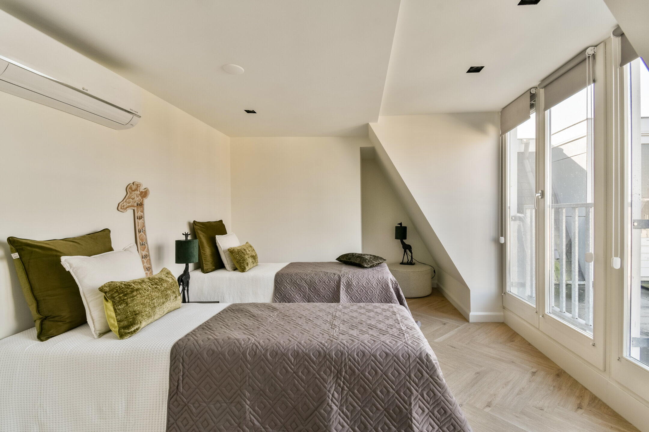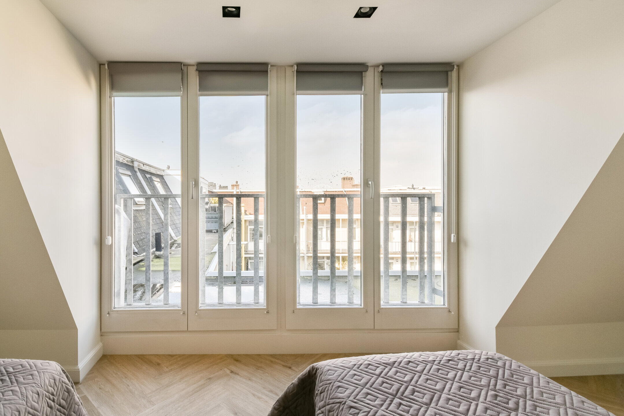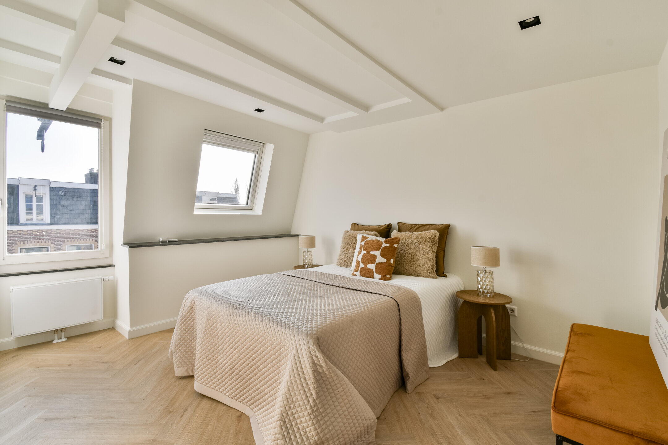 Via de interne trap bereikt u de vierde verdieping. Hier bevinden zich nog twee slaapkamers, beide met een speelse kapconstructie die zorgt voor een karakteristieke en sfeervolle uitstraling. De hoofdslaapkamer is royaal en biedt voldoende ruimte voor een groot bed en kastruimte.