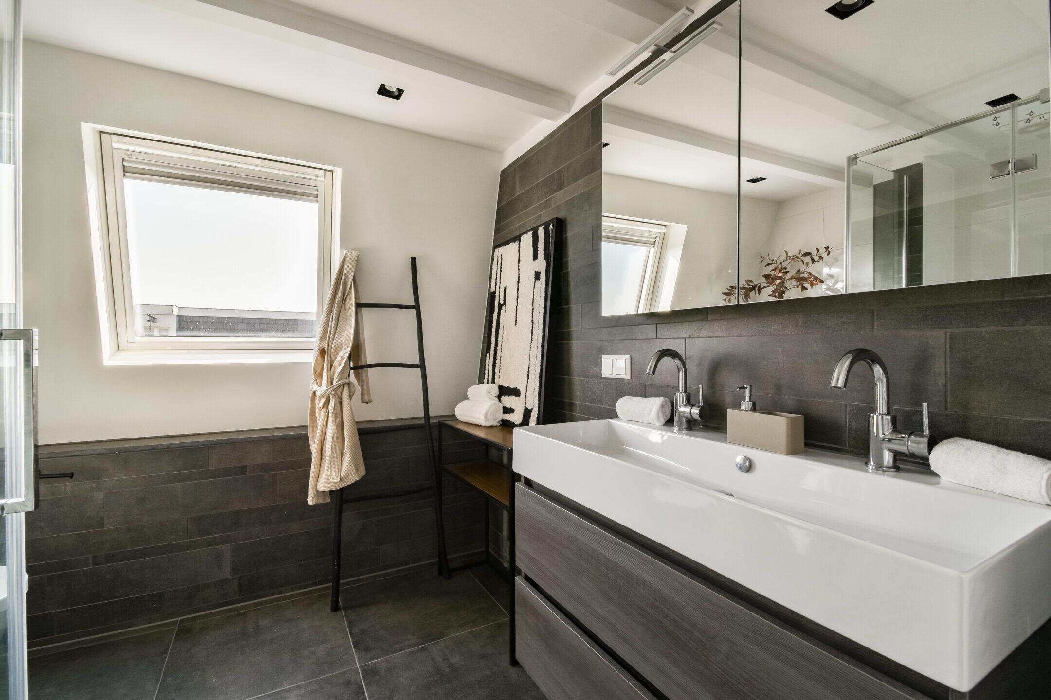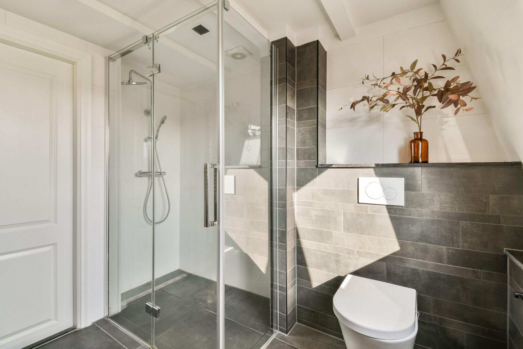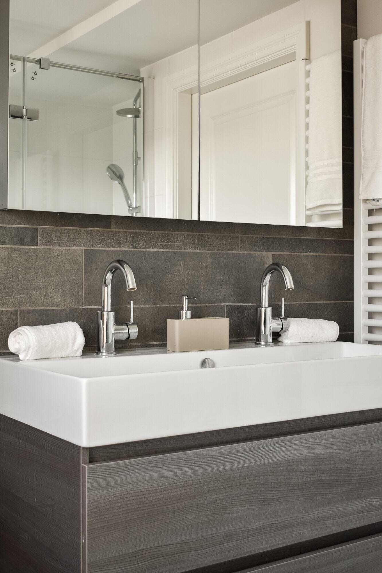 De moderne badkamer is verzorgd afgewerkt en beschikt over een ruime inloopdouche, dubbele wastafel met meubel en toilet. Dankzij de neutrale kleurstelling en het hoogwaardige tegelwerk heeft de ruimte een tijdloze en luxe uitstraling.